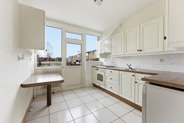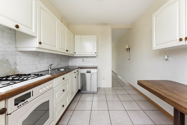 Keuken: De halfopen keuken is praktisch ingedeeld in een hoekopstelling en voorzien van inbouwapparatuur, waaronder een oven, 4-pits gasstel, afzuigkap en vaatwasser. Via de loopdeur heb je toegang tot het balkon aan de voorzijde. De keuken is functioneel, maar biedt volop kansen om hier een eigen droomkeuken te realiseren. De ruimte is afgewerkt met een plavuizenvloer, behangwanden en een gestuukt plafond.