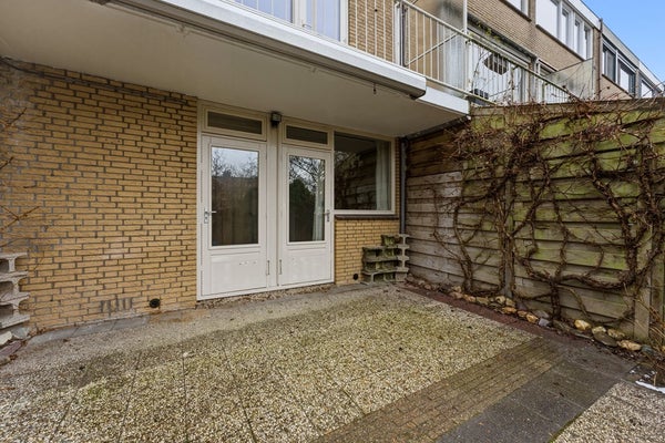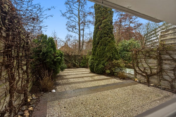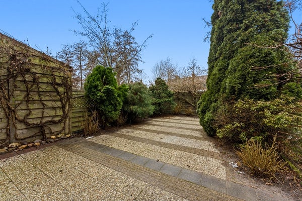 Achtertuin: De achtertuin (afm. ca. 10,4 x 5,1 m) ligt op het westen en is aangelegd met sierbestrating en diverse plantenborders met onder andere druiven. Hier geniet je van vrij zicht en veel privacy. Dankzij het zonnescherm aan de gevel creëer je eenvoudig een fijne schaduwplek op warme zomerdagen.
