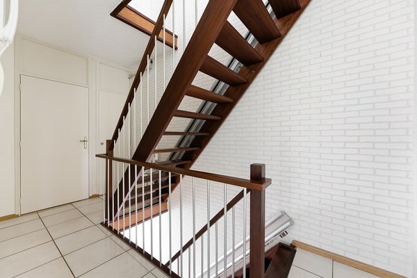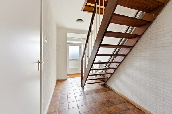 Entree: Je komt de woning binnen op de begane grond, waar je toegang hebt tot een tuinkamer en de inpandige garage. Via de trap bereik je de eerste verdieping. De ruimte is afgewerkt met een plavuizenvloer, granol en behang op de wanden en een structuurplafond.