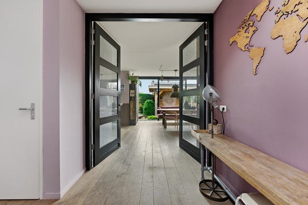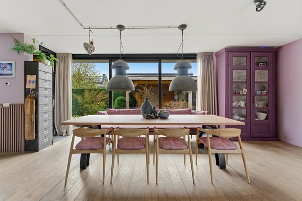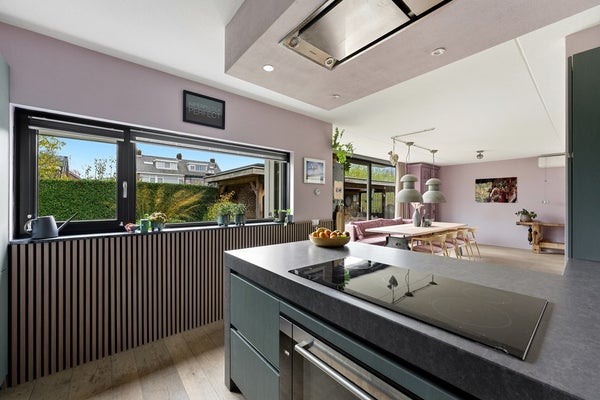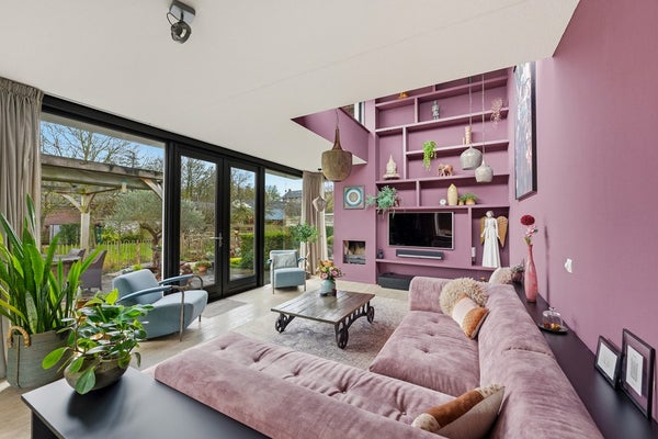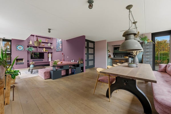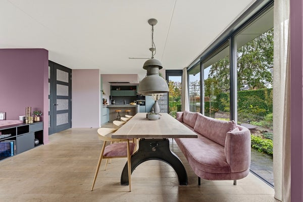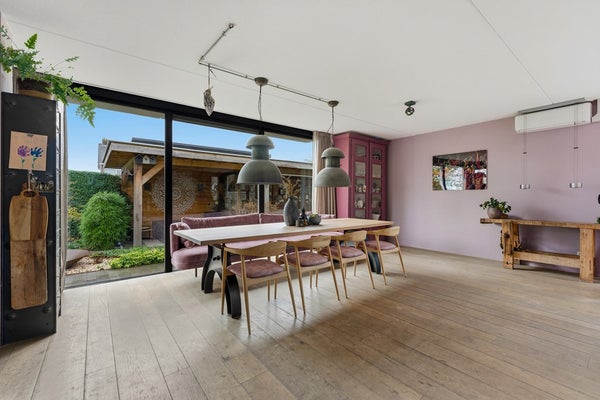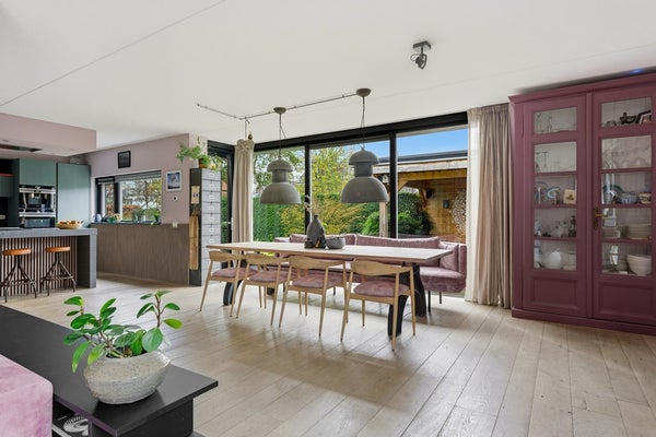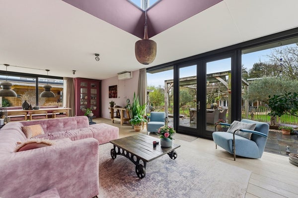 Woonkamer: De woonkamer is een echte eyecatcher: zeer ruim en met grote raampartijen in de zijgevel die voor veel lichtinval zorgen. Aan de achterzijde leiden dubbele deuren naar de tuin en in het zitgedeelte komt extra licht binnen via ramen in het dak. Daarnaast is er een openhaard en airconditioning aanwezig, wat de ruimte het hele jaar door aangenaam maakt. De afwerking bestaat uit een Frans eiken vloer, behangwanden en spuitwerkplafond.