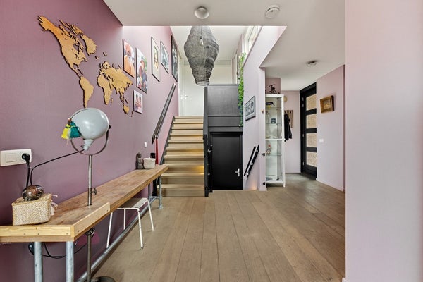 Entree: De hal is royaal opgezet en ontvangt veel licht door de raampartij in het dak. Vanuit de hal is er toegang tot de woonkamer, de slaapkamer, de toiletruimte, de meterkast, de garage en de trapopgang naar de verdieping. De afwerking bestaat uit een vloer van Frans eiken, glasvliesbehangwanden en een plafond met spuitwerk.