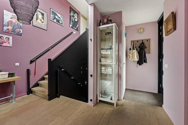 Trapkast: Onder de trap naar de garage bevindt zich een trapkast met de verdeler voor de vloerverwarming en ruimte voor jassen, opbergrekken en een waterontharder.