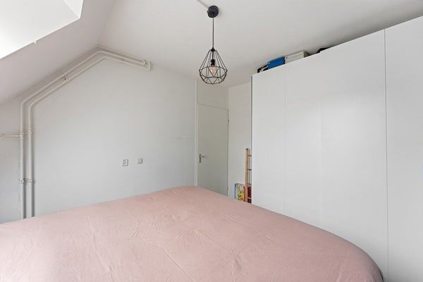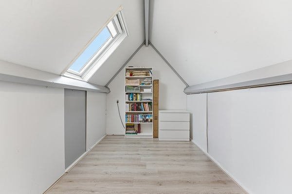 Slaapkamer 1: Slaapkamer één ligt aan de achterzijde van de woning en heeft een dakraam. De ruimte is geschikt als slaap- of werkkamer en heeft een rustige indeling. De afwerking bestaat uit laminaat, behang op de wanden en een spuitwerkplafond.