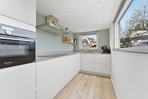 Keuken: De open keuken bevindt zich in de aanbouw en heeft twee grote ramen waardoor er veel licht binnenkomt. De keuken is ingericht met een praktische hoekopstelling en is uitgerust met diverse A-merk inbouwapparatuur, zoals een combi-oven, inductiekookplaat, afzuigkap, vriezer, koelkast en vaatwasser. Via een deur is er directe toegang tot de achtertuin, wat een handige en praktische verbinding tussen binnen en buiten biedt. De afwerking sluit aan op de woonkamer en heeft een verlaagd plafond in de aanbouw.