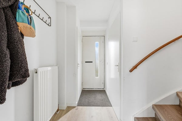 Entree: De hal biedt toegang tot de toiletruimte, de woonkamer, de meterkast en de trap naar de eerste verdieping. De hal is afgewerkt met een PVC-vloer, gestuukte wanden en een spuitwerk plafond.