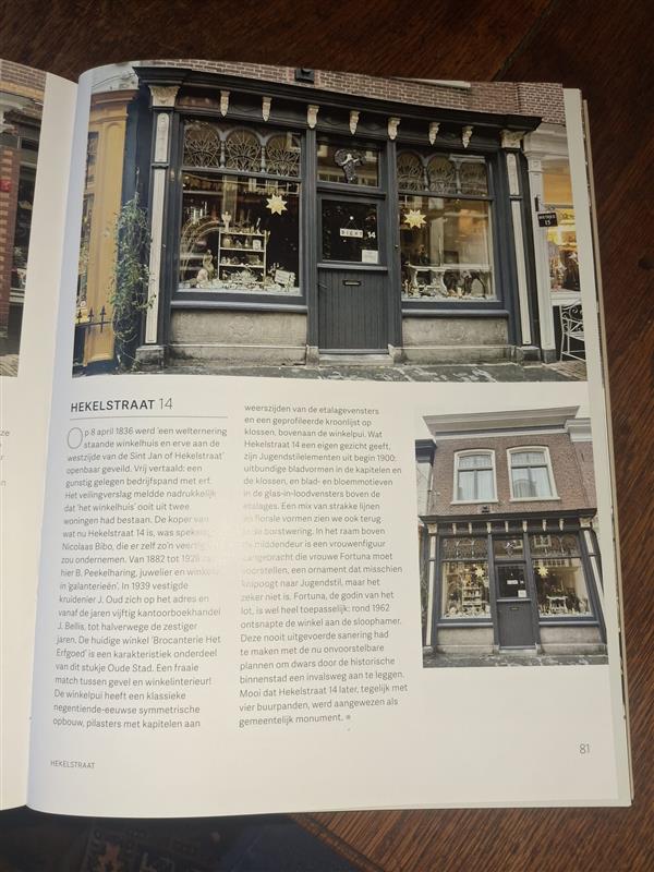 Hekelstraat 14 werd in 1836 geveild als winkelhuis met erf en was oorspronkelijk twee woningen. Spekslager Nicolaas Bibo vestigde zich er en bleef er zo’n veertig jaar. Later volgden onder anderen juwelier Peekelharing, kruidenier Oud en kantoorboekhandel Bellis. Nu is hier Brocanterie Het Erfgoed gevestigd.
