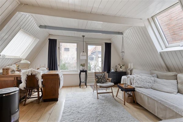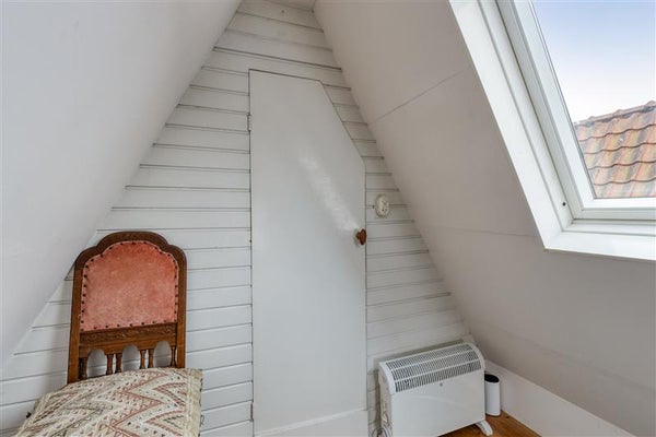 De tweede verdieping is een knus hoogtepunt. Hier vind je twee charmante kamers onder het puntdak, waar een warme sfeer gecreëerd wordt door de speelse lijnen van het dak en het romantische uitzicht. Stel je voor: een kinderkamer vol fantasie, een serene logeerkamer of een intieme werkruimte met voldoende daglicht. De mogelijkheden zijn eindeloos.
