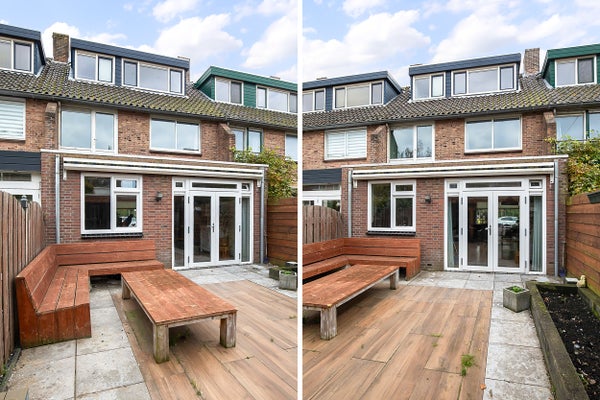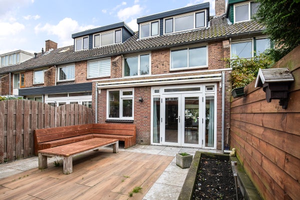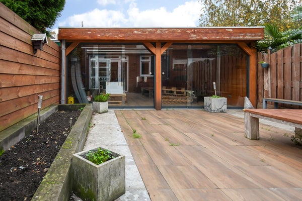 De verzorgde achtertuin op het westen heeft een veranda met elektra en glazen schuifdeuren. Naast de woning is er een garage te koop.