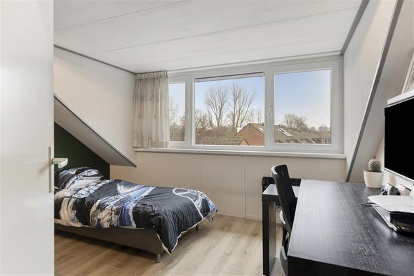 Ga je een verdieping omhoog, dan ontdek je drie prettige slaapkamers die uitnodigen om zowel te ontspannen als productief te zijn. De kamers zijn stuk voor stuk smaakvol ingedeeld en kunnen bijvoorbeeld dienstdoen als logeerkamer, kinderkamer of een thuiswerkplek. Handig, toch?