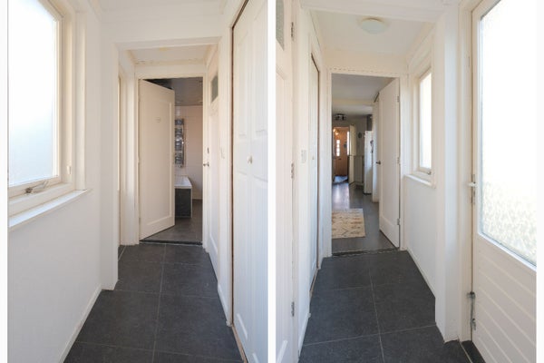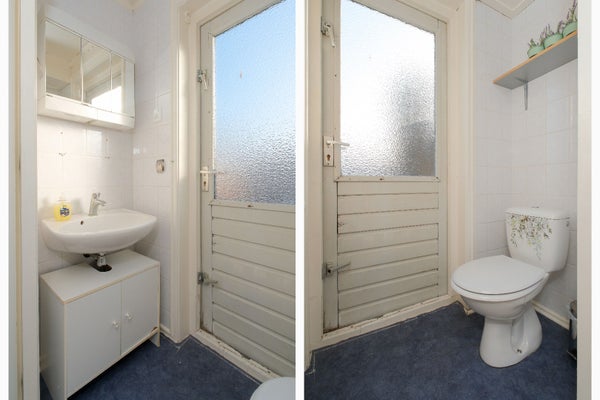 Doorloop naar een hal met een opbergkast, apart toilet en toegang naar de moderne badkamer met inloopdouche, duo bad, dubbele wastafelmeubel, designradiator, ook hier toegang naar buiten. De gehele begane grond heeft mooie authentiek plafonds, paneeldeuren met in de stijl van de woning bijpassende deurklinken.