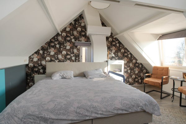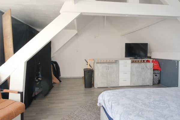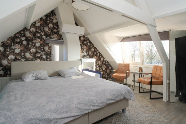 Vaste trap naar de zeer ruime 3e slaapkamer, wat een ruimte met veel licht door de aanwezigheid van een dakkapel, de kozijnen op deze verdieping zijn van kunststof en er is airco aanwezig. Aan de zijkant handige knieschotten voor extra berging en op deze verdieping ligt een laminaatvloer. Vanuit deze slaapkamer kun je de 14 zonnepanelen zien.