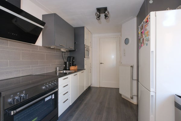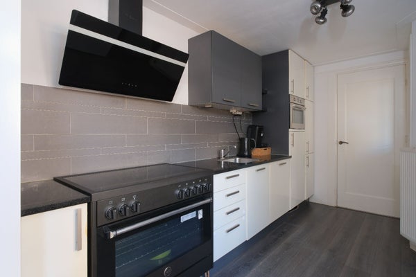 Toegang naar de keuken met diverse inbouwapparatuur w.o. 5 pits elektrische kookplaat met extra brede oven, afzuigkap, vaatwasser, koelkast en combimagnetron.
