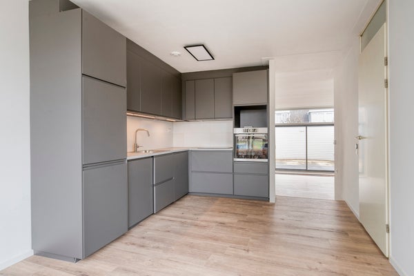 Bij binnenkomst word je verwelkomd door een lichte woonkamer met verhoogde keuken. De vele ramen zorgen voor een warme, uitnodigende sfeer. De L-vormige keuken is praktisch en modern. Veel mensen hebben hier ook een ronde eettafel staan.