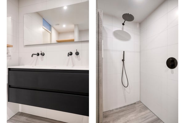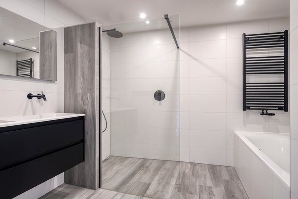 Moderne badkamer met instapdouche, ligbad, luxe meubilair met dubbele wasbakken