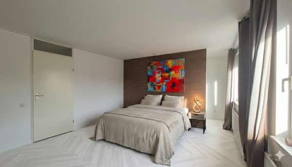 Op de eerste verdieping vind je twee grote slaapkamers. De grote slaapkamer met walk-in ruimte is destijds samengevoegd uit twee kamers. De luxe badkamer is netjes en ruim. Op de overloop bevindt zich een tweede, modern toilet.