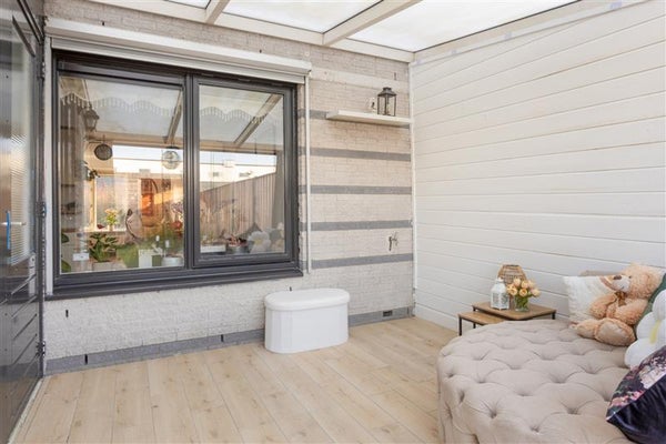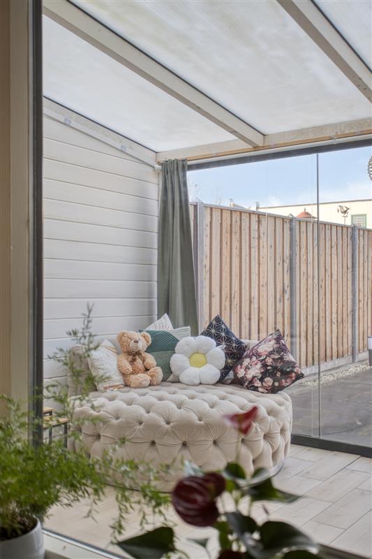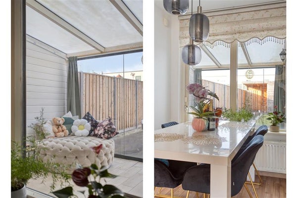 Aan de achterzijde van de hal vind je een deur die leidt naar de serre. Deze aangebouwde extra ruimte is een echte meerwaarde: licht, ruim en veelzijdig. Vanuit deze serre heb je bovendien direct toegang tot de aangebouwde praktijkruimte. Hier ligt de kracht van extra functionaliteit: een perfecte ruimte om te werken of te gebruiken als hobbyruimte. De mogelijkheden zijn eindeloos.
