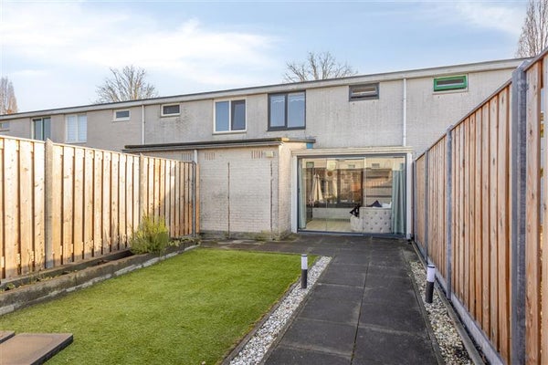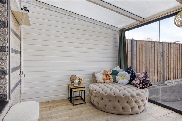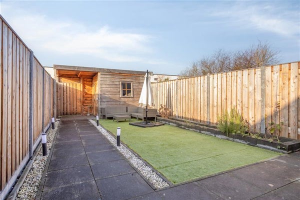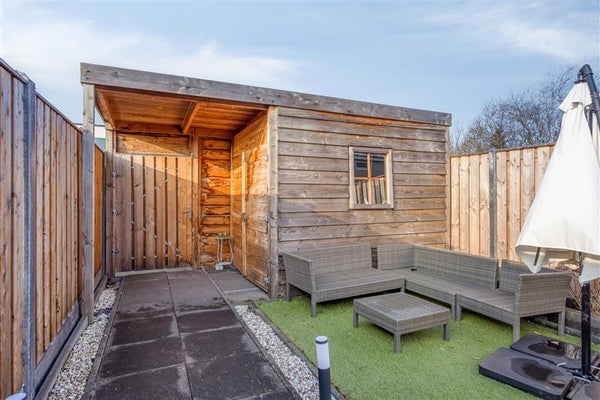 Buiten is het net zo fijn vertoeven. De achtertuin ligt op het noordwesten, wat betekent dat je de middagzon volop binnenkrijgt en de avonden heerlijk kunt verlengen in het zonnetje. Met een houten berging en een overkapping is er genoeg ruimte voor opslag en zitplekken. De achterom maakt het makkelijk om fietsen of spullen naar binnen en buiten te halen zonder door het huis te hoeven lopen.