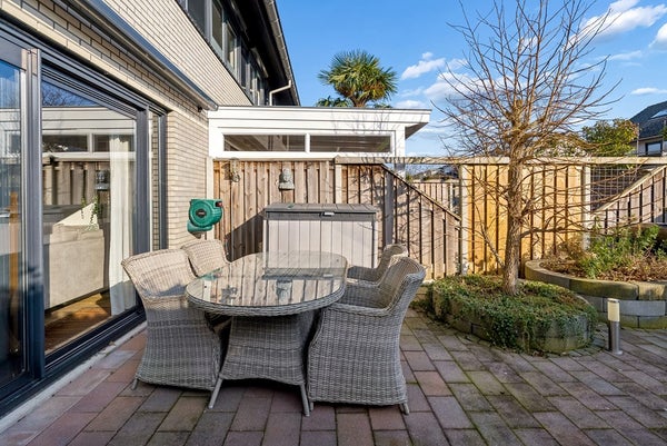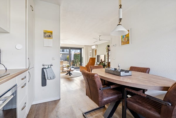 De zithoek is aan de tuinkant gelegen en is erg licht door de grote schuifpui. Vanuit de woonkamer heb je een leuk uitzicht over de tuin.