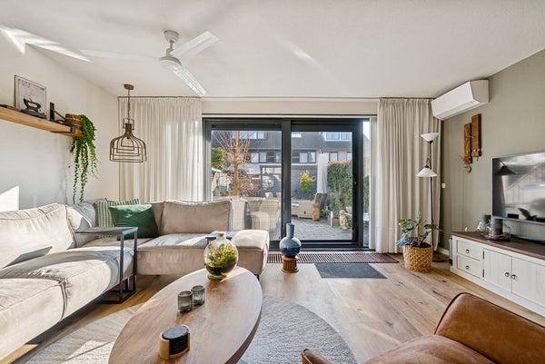 De grote raampartij aan de voorkant van de woning maakt het zeer licht. De gehele begane grond is voorzien van een keurige wand- en vloerafwerking. Een prettige toevoeging is de airco op deze woonlaag. De trapopgang naar de 1e verdieping bevindt zich in de woonkamer.