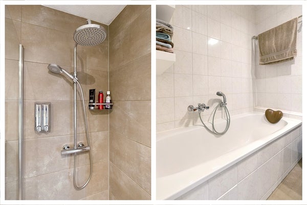 De badkamer is voorzien van een douchecabine, toilet, ligbad en wastafel. De mechanische ventilatie zorgt voor de afvoer van condens.