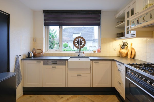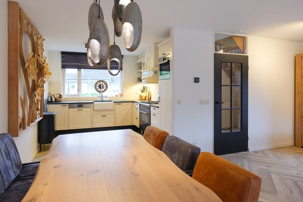 De open keuken ligt aan de voorzijde, in hoekopstelling, heeft een landelijke uitstraling met ruim voldoende kasten en laden voor het opbergen van uw keukengerei. Deze keuken is voorzien van de gangbare inbouwapparatuur, waaronder een combi /magnetron, een 5-pits gastoestel met een elektrische oven (Boretti) en een afzuigkap, vaatwasser, koelkast en kunststof werkbladen.