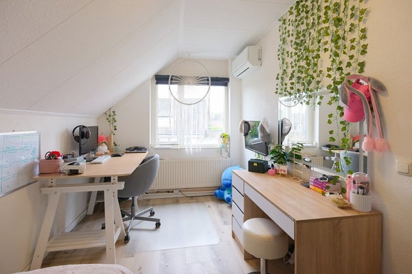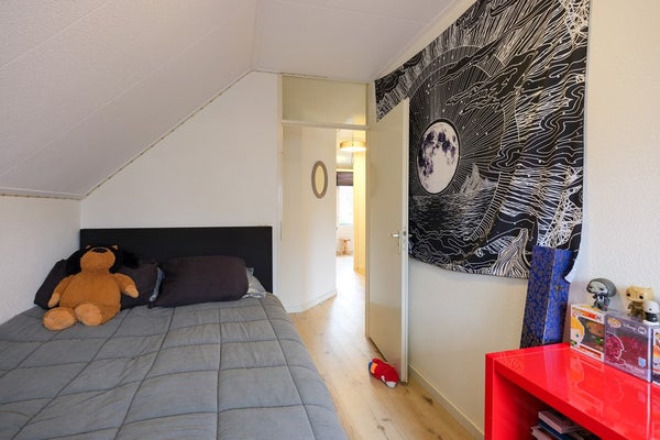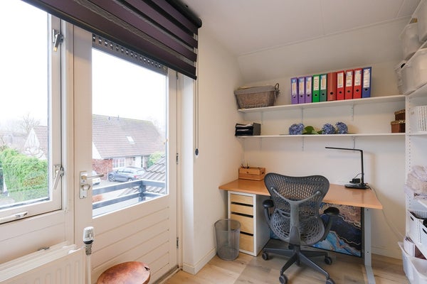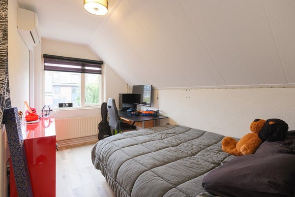 De L- vormige overloop geeft toegang tot vier slaapkamers van goed formaat waarvan 1 met een klein balkon en een goede, moderne badkamer (2024) met inloopdouche, een luxe wastafelmeubel met verwarmde spiegel, 2e vrij hangend toilet, een designradiator en elektrische vloerverwarming. De badkamer is volledig betegeld in fraaie kleurstelling. De drie grootste slaapkamers zijn voorzien van airconditioning. Er is een aparte bergruimte waar de CV-ketel (2021) en mechanische ventilatie unit zijn geïnstalleerd. De gehele vloer van de verdieping is voorzien van een PVC vloer. Vanaf de overloop is via een luik met vlizotrap de bergzolder bereikbaar. Een ideale plaats voor het opbergen van spullen welke u niet dagelijks nodig heeft. De bergzolder loopt over de volledige lengte van het huis, is bijna 4 meter breed en heeft een nokhoogte van 1,22 meter.