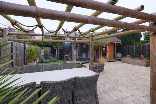 De buitenruimte is eveneens netjes afgewerkt. De achtertuin (noordwesten) heeft een fraaie omheining op de perceelgrenzen en is voldoende diep en breed om op ieder moment van de dag te genieten van de zon of juist even van de schaduw te genieten. Aan de achterzijde wordt de tuin begrensd door overkapping met tuinkamer en een aangebouwde berging. De tuin is grotendeels bestraat maar verrijkt met fraaie “groene” accenten.