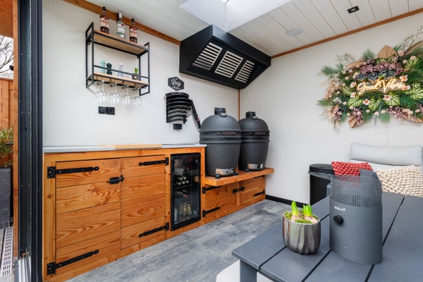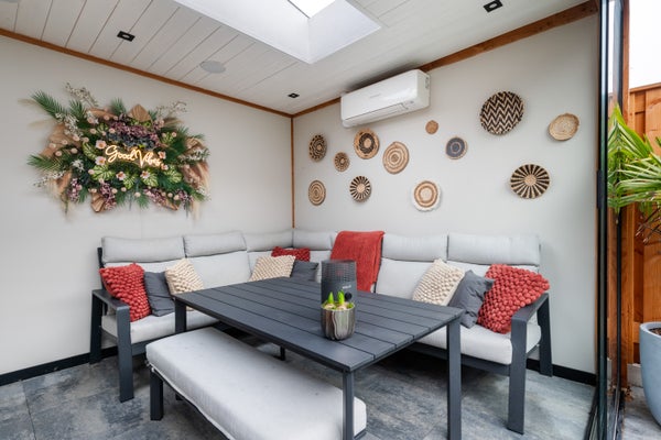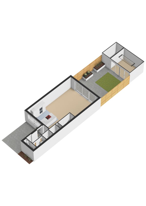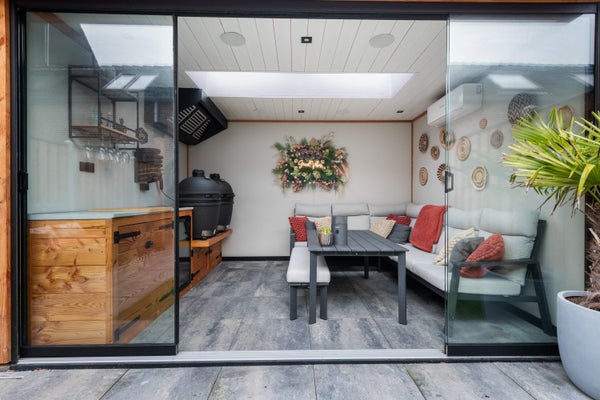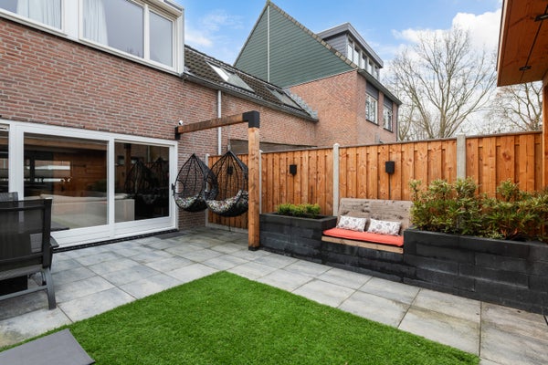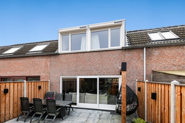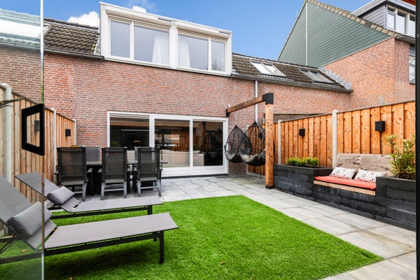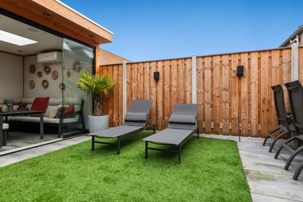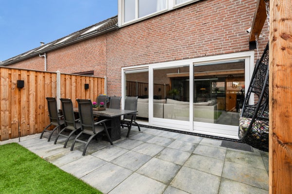 De achtertuin is modern en verzorgd aangelegd en biedt meer dan alleen buitenruimte. In de tuin staat een volledig vernieuwd buitenhuis, afgewerkt met nieuwe vloertegels en voorzien van airconditioning. Ideaal als lounge, thuiswerkplek of hobbyruimte.