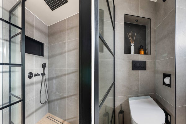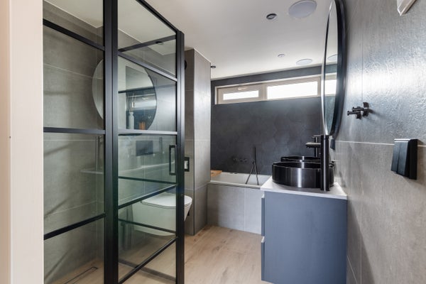 De luxe badkamer is compleet en modern ingericht met een douchecabine, een ligbad, een modern badmeubel en een toilet. Ook hier zorgt de vloerverwarming op warm water voor extra comfort.