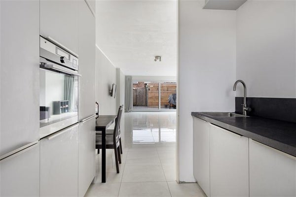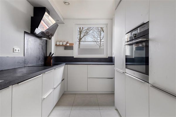Aan de voorzijde vind je een ruime AEG-keuken uit 2022 in een praktische L-vorm. De strakke, witte keukenkasten en hoogwaardige inbouwapparatuur – waaronder een koelkast, vrieskast, stoomoven, vaatwasser en een 5-pits inductiekookplaat creëren de perfecte setting voor elke kookliefhebber. Een groot openslaand raam met uitzicht over de straat en afgewerkt met een rolluik zorgt voor extra lichtinval en ventilatie.