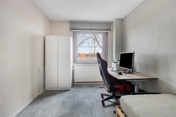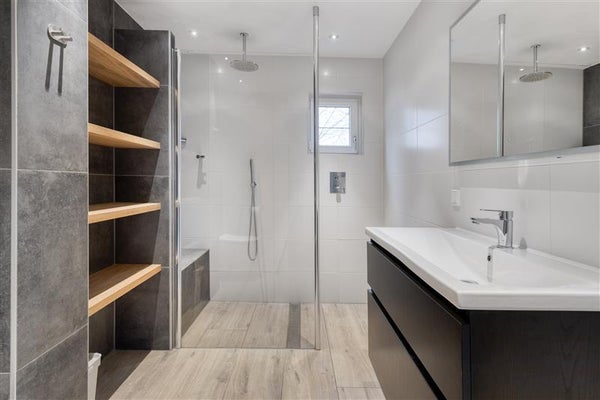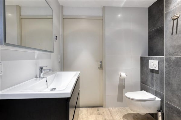 Via de hal kom je op de eerste verdieping, waar twee kamers voor je klaarstaan. De grootste slaapkamer meet ruim 21 m² en kan eventueel worden opgesplitst in twee kleinere vertrekken, afhankelijk van jouw wensen. De moderne badkamer (2022) is ingericht met een inloopdouche voorzien van een douchebank, een stijlvol wastafelmeubel, een zwevend toilet en elektrische vloerverwarming onder de plavuizen. De overige ruimtes op deze verdieping zijn afgewerkt met een laminaatvloer.
