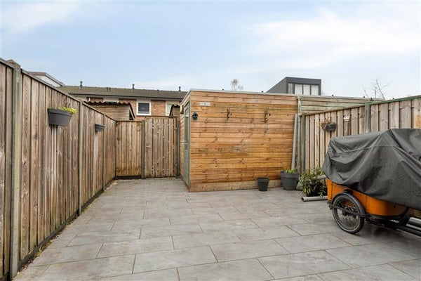 De onderhoudsarme tuin is vakkundig aangelegd met grote, cementgestorte tegels, waardoor onkruid tot het verleden behoort. De tuin is omzoomd met stevige schuttingen en combineert zowel zon- als schaduwrijke plekken, zodat je optimaal kunt genieten van je buitenruimte. Een houten berging, voorzien van een vernieuwd dak (2023) en nieuwe rabatdelen (2024), maakt het geheel compleet.