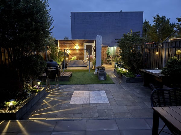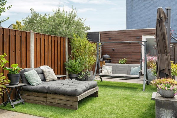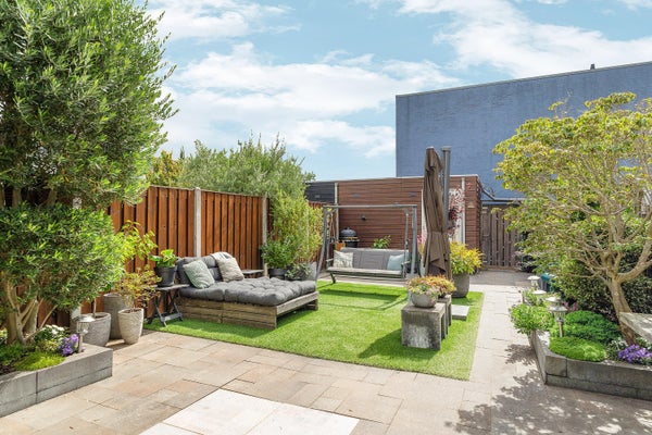 Hier drink je je eerste koffie in de ochtendzon en geniet je ’s avonds beschut van lange zomeravonden. Een tuin die voelt als een extra woonkamer.