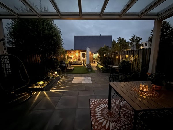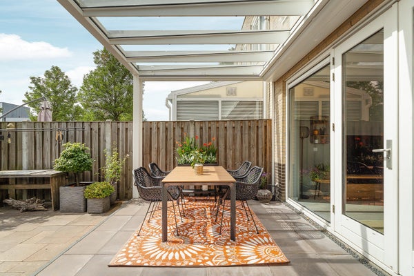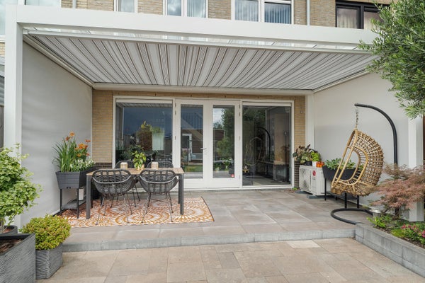 De fraai aangelegde achtertuin**(11 meter lang)** met royale terrasoverkapping(over de volle breedte van het huis) voorzien van electrische bedienbare zijpanelen en zonnescherm(bedienbaar via de app) verlengt het woongenot naar buiten.