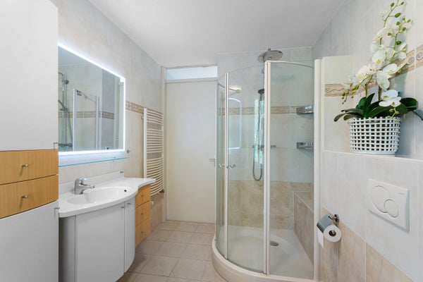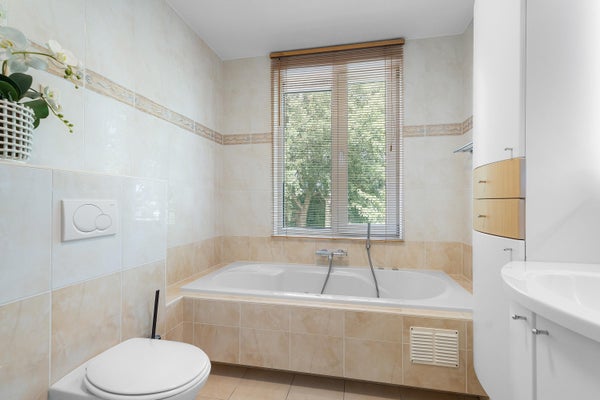 De complete badkamer voelt verzorgd en ontspannen, voorzien van een ligbad met bubbelfunctie, douche, wastafelmeubel en tweede toilet – jouw eigen plek om de dag rustig te beginnen of juist af te sluiten.