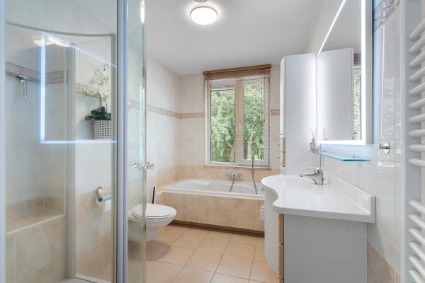 The complete bathroom feels calm and well maintained, featuring a bathtub with bubble function, shower, vanity unit and second toilet—your own place to start or end the day in comfort. Outdoor Space: The beautifully landscaped backyard (11 meters deep) with a generous covered terrace extends the living experience outdoors.