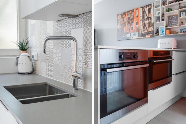Moderne leefkeuken met schiereiland en inbouwapparatuur