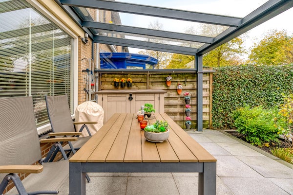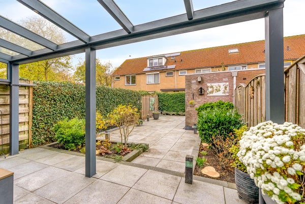 - de achtertuin is een waar pareltje: gelegen op het zuidwesten en met 15m2 vergroot. De tuin is fraai aangelegd met terrassen, een overkapping met verlichting en een zonnescherm, borders en een stenen berging.