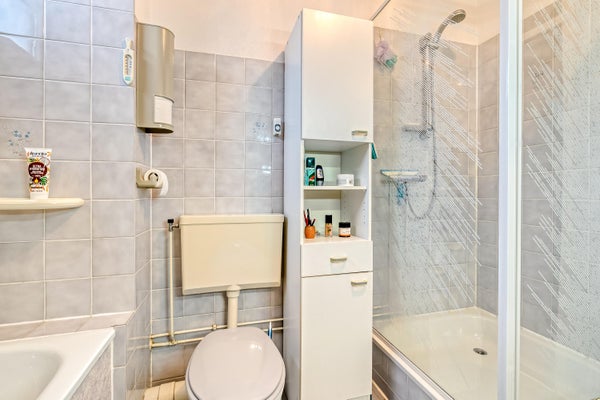 - badkamer met douchecabine, ligbad, toilet, wastafel en designradiator. In de badkamer is ook een openslaand raam aanwezig
