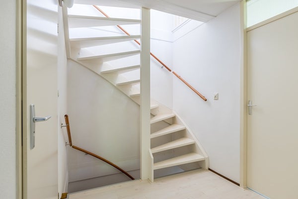 Op de begane grond ligt een hardstenen vloer en deels parket, beide voorzien van vloerverwarming. Vanuit de woonkamer bereik je via een deur de trapopgang naar de eerste verdieping. Achter deze deur bevindt zich tevens het eerste toilet.