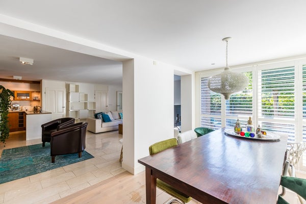 Aan de achterzijde is een serre uitgebouwd, waardoor de woonkamer extra ruim aanvoelt en er een prachtige plek is ontstaan voor de eethoek. De serre beschikt over grote raampartijen tot aan het plafond, voorzien van shutters, en openslaande deuren naar de tuin.