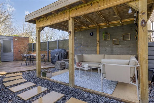 zonnige tuin met privacy, berging en sfeervolle overkapping;