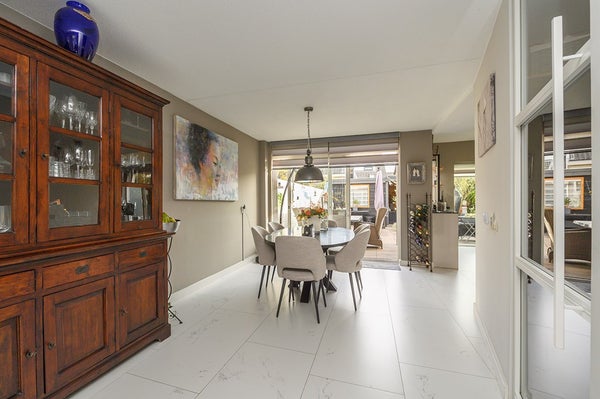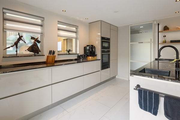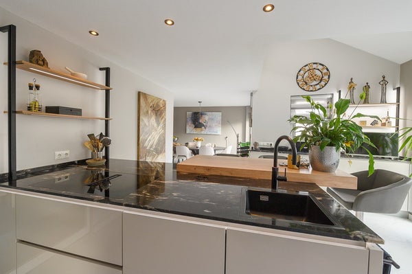 - Kitchen: modern luxury kitchen extended and renovated in 2021, consisting of several kitchen units with various base and wall cabinets, as well as a cooking and washing-up island with a breakfast bar. The kitchen is finished in a beautiful soft and light colour with a solid black granite worktop. The kitchen has various built-in appliances, namely a fridge-freezer, climate cabinet, steam oven, combi-oven, induction hob with cooktop extractor, dishwasher and Quooker, which can also be used optionally with a CO2 cartridge for sparkling water. The kitchen has air conditioning and a second sliding door (2021) to the garden.