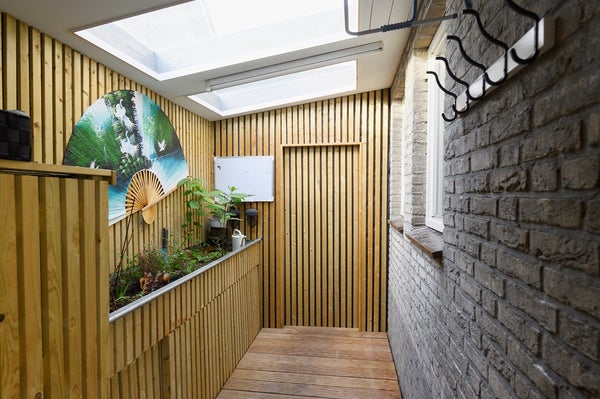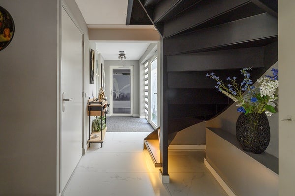 Dichte trap naar de eerste verdieping: in 2021 voorzien van verlichting en treden met eikenhout.