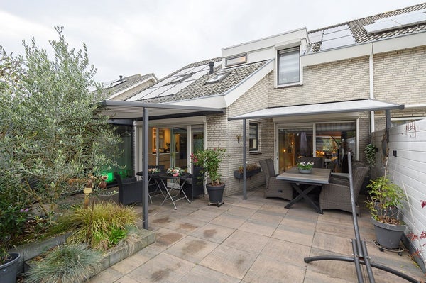 Twee electrisch te bedienen zonneschermen bij de twee schuifpuien aan de achterzijde.