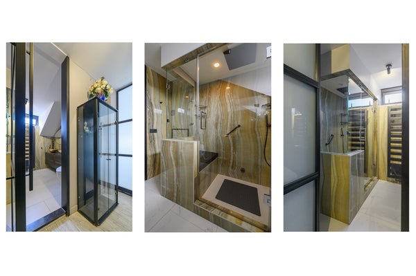 Badkamer: zeer luxe badkamer, volledig verbouwd in 2021. In deze badkamer waan je je in een luxe spa. De doucheruimte met zitgedeelte is volledig afsluitbaar en is voorzien van een stoomfunctie. Fraai donkerbruin meubel voorzien van 2 waskommen en spiegel met led-verlichting. Een moderne toiletcombinatie die verwarmt, droogt en als bidet te gebruiken is. Op de vloer zijn keramische vloertegels aangebracht en de wanden zijn voorzien van prachtige keramische wandplaten met natuursteen.
