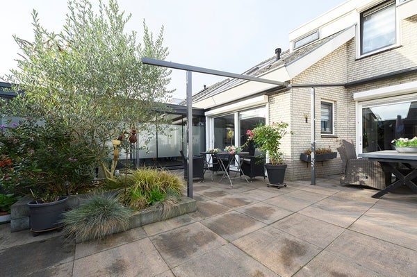 Tuin aan de achterzijde, met serre voorzien van jacuzzi, sauna en douche. Deze serre is gedeeltelijk te openen door middel van glazen schuivende panelen. Overkapping voorzien van buitenhaard. Kantoorruimte, thans in gebruik als gastenkamer.