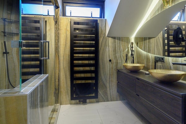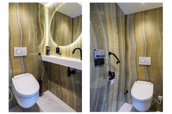 - Ground floor toilet: equipped with a modern toilet combination that heats, dries and can be used as a bidet, washbasin and mirror with LED lighting. The floor is covered with ceramic floor tiles and the walls are fitted with beautiful ceramic wall panels with natural stone.