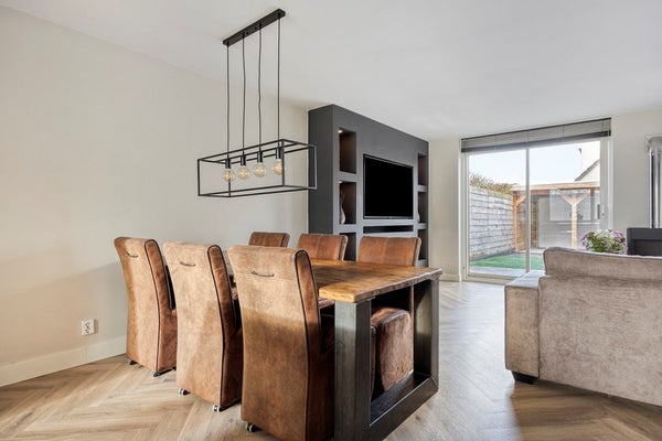 De royale woonkamer biedt volop ruimte voor een gezellige zithoek en een grote eettafel. Dankzij de schuifpui heeft u direct toegang tot de zonnige achtertuin op het noordwesten. Hier vindt u een terrasoverkapping met roldeur, waardoor u optimaal kunt genieten van lange zomeravonden – in de zon of juist in de schaduw.