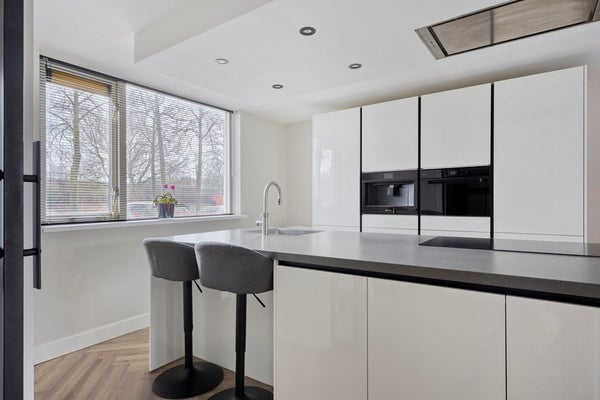 Aan de voorzijde van de woning bevindt zich de luxe open keuken met kookeiland. De keuken is voorzien van hoogwaardige inbouwapparatuur van Bauknecht, waaronder een combimagnetron, vaatwasser, koelkast en een 5-pits kookplaat. De ingebouwde afzuigkap van Novi is stijlvol verwerkt in het kookeiland. Daarnaast beschikt de keuken over een ingebouwde koffiemachine en een Quooker – ideaal voor de kookliefhebber.